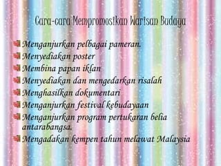 Ada berapa cara utama untuk mempromosikan warisan budaya Malaysia di dalam dan luar negara. Cara yang paling efektif dalam memartabatkan warisan budaya Malaysia melalui mempromosikannyaCara-cara mempromosikannya ialah menganjurkan pelbagai pameranmengadakan forummemberikan ceramahmenyediakan postermembina papan iklan. Menghasilkan dokumentasi mengajur lawatan.